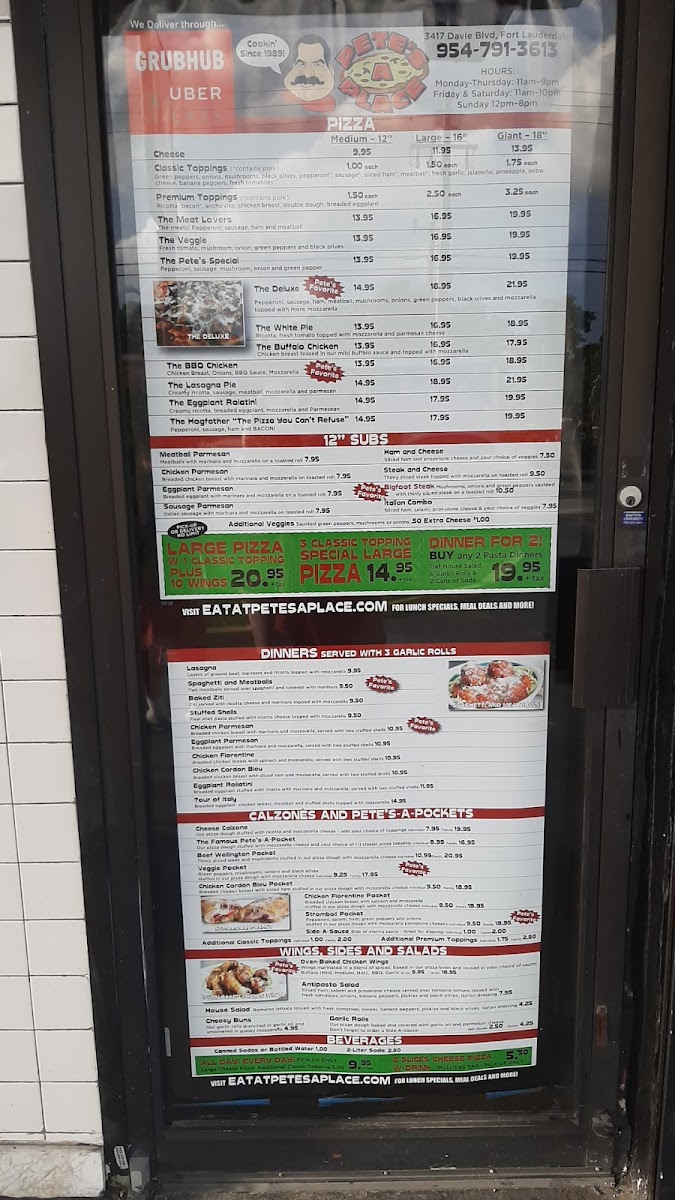 Welcome to PETE'S A PLACE, a beloved gem located at 3417 Davie Blvd, Fort Lauderdale, where the essence of East Coast pizza comes alive. Known for its exceptional pizza and friendly service, Pete's has been a local favorite since its humble beginnings as a trailer. Customers rave about the perfect cheese and loaded toppings, with the Pete's deluxe stealing the show as a must-try.
